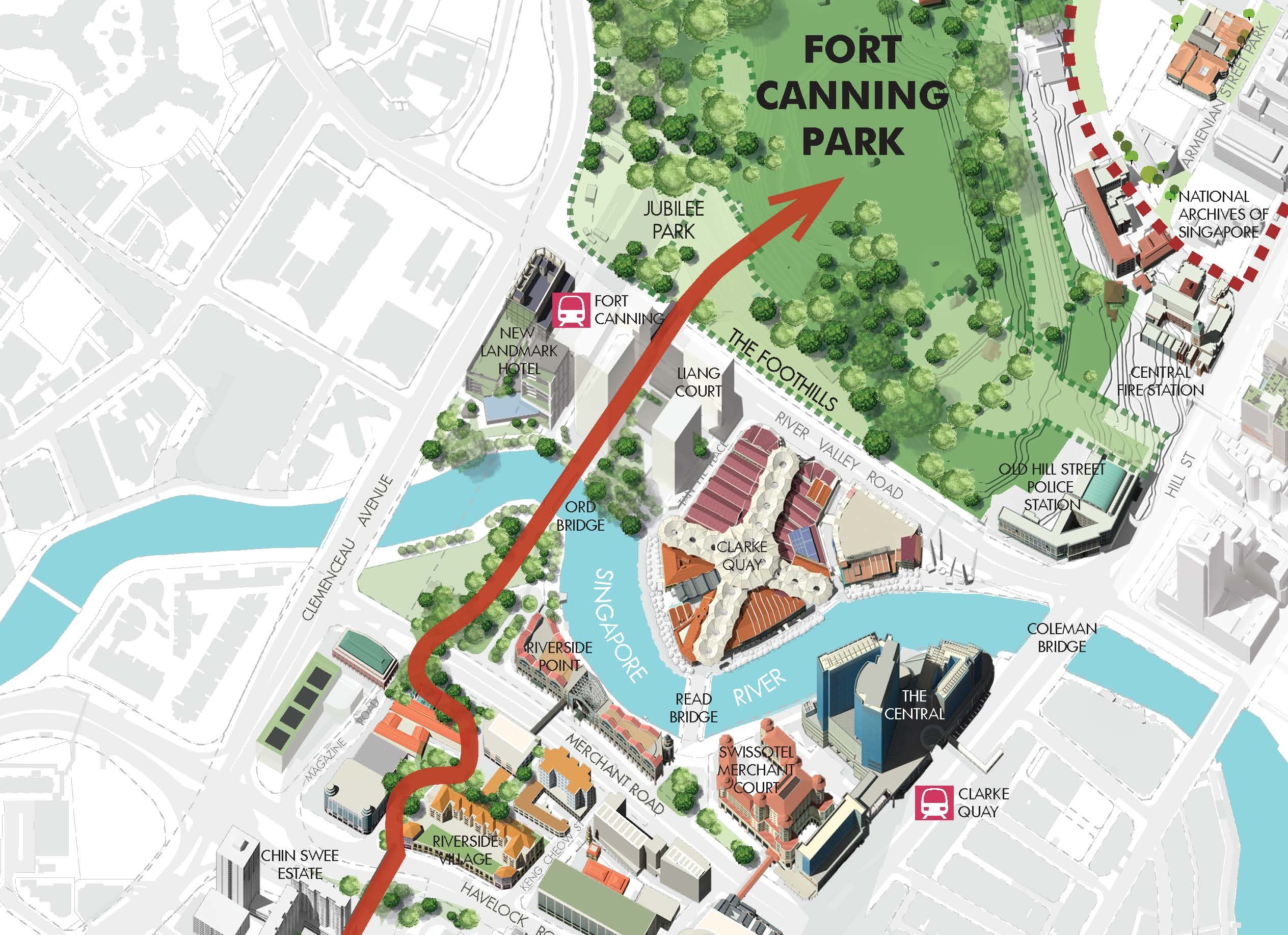 Canninghill Piers is situated in the heart of Clarke Quay, part of Singapore river planning area, and on the fringe of Singapore’s Central Business District. It is directly link to Fort Canning MRT Station on the Downtown Line through Canninghill Square and is a short walk to Clarke Quay MRT Station on the North East Line. Fort Canning Park, a well-known historical hilltop landmark, is accessible via a connected overhead bridge.